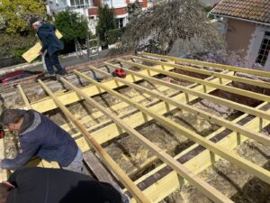 Nous réalisons la charpente pour tous types de toitures, qu’il s’agisse d’un toit plat, d’un toit à deux pans ou de formes plus complexes. Chaque structure est conçue sur mesure en fonction de la configuration du bâtiment, des contraintes techniques et du type de couverture choisi. Nous assurons la fabrication, la pose et le renforcement de charpentes traditionnelles ou industrielles, en veillant à garantir solidité, durabilité et parfaite étanchéité de l’ensemble de la toiture.
